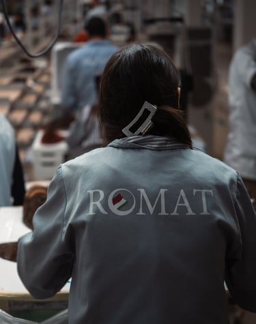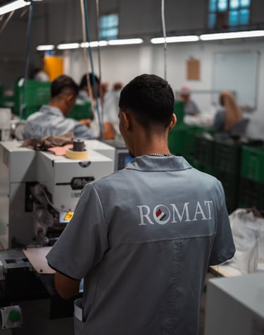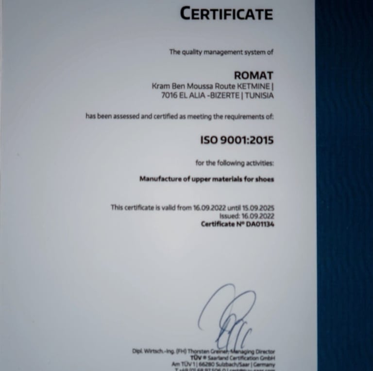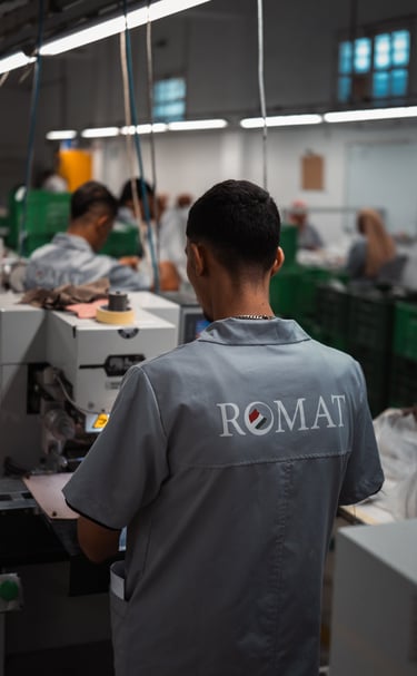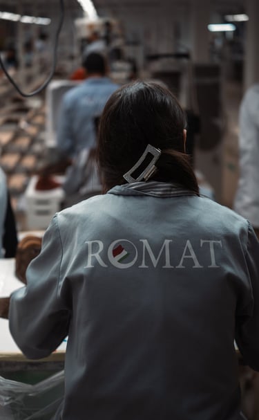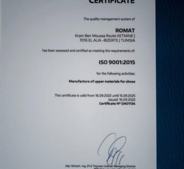 ROMAT SARL, è dal 2007 l’azienda leader nel settore della produzione di tomaie per calzature. Su una superficie di circa 2000 mq, la sua sede operativa, in Tunisia, nella zona di El Alia a Bizerte vede operare a massimi livelli di professionalità circa 200 operai, suddivisi nei reparti taglio, preparazione/scarnitura, orlatura, magazzino ed infine amministrazione.